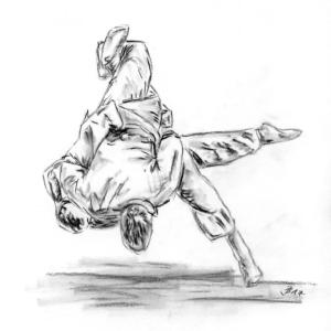 Jim wirft Uchi-mata (2017, Kohle, 20 × 20)